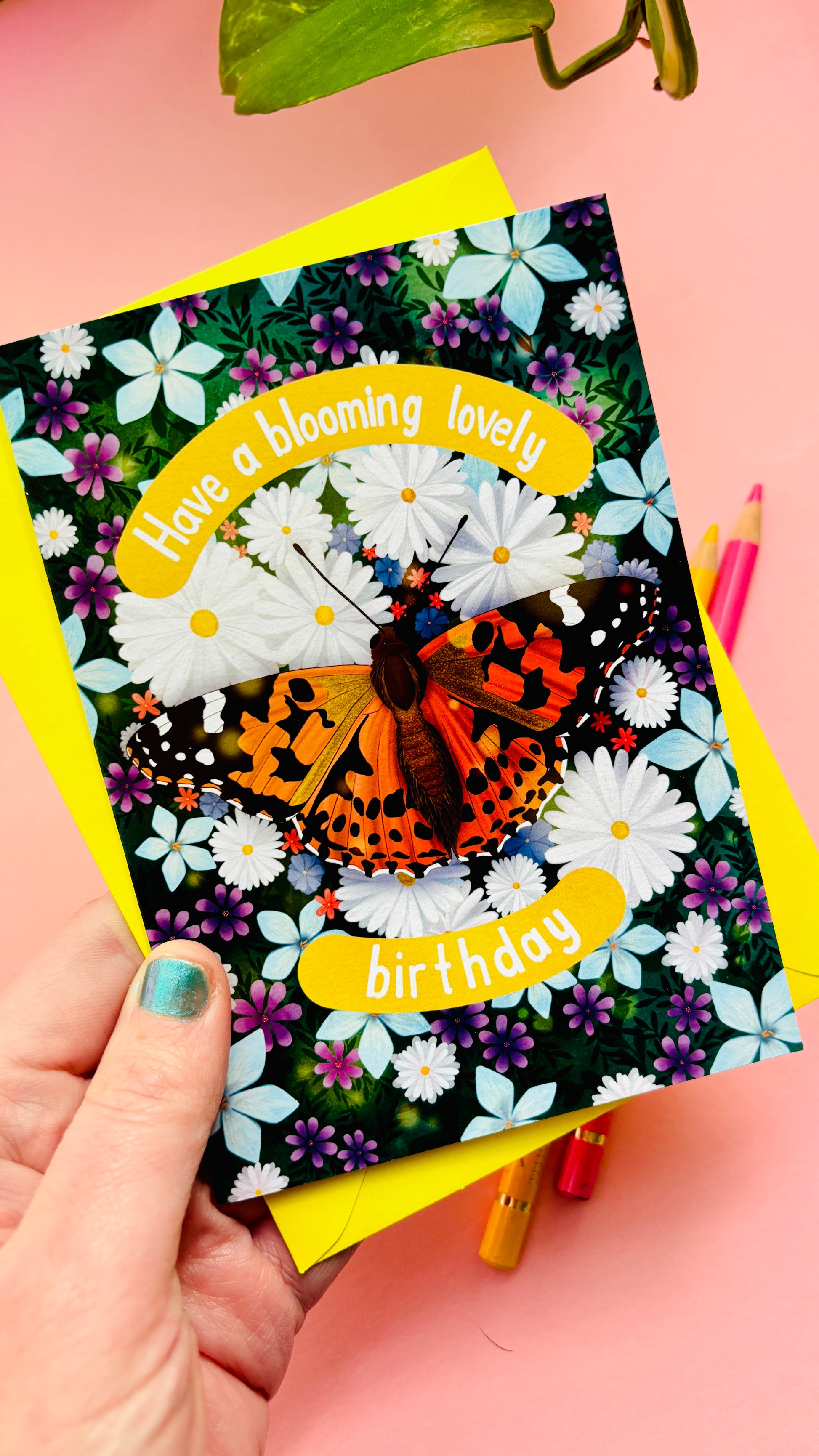 Make their birthday extra special with this bright and joyful hand-illustrated Painted Lady butterfly birthday card. Featuring a detailed Painted Lady butterfly in a wildflower meadow, the front reads “Have a blooming lovely birthday”, adding a cheerful, nature-inspired message to your greetings.
