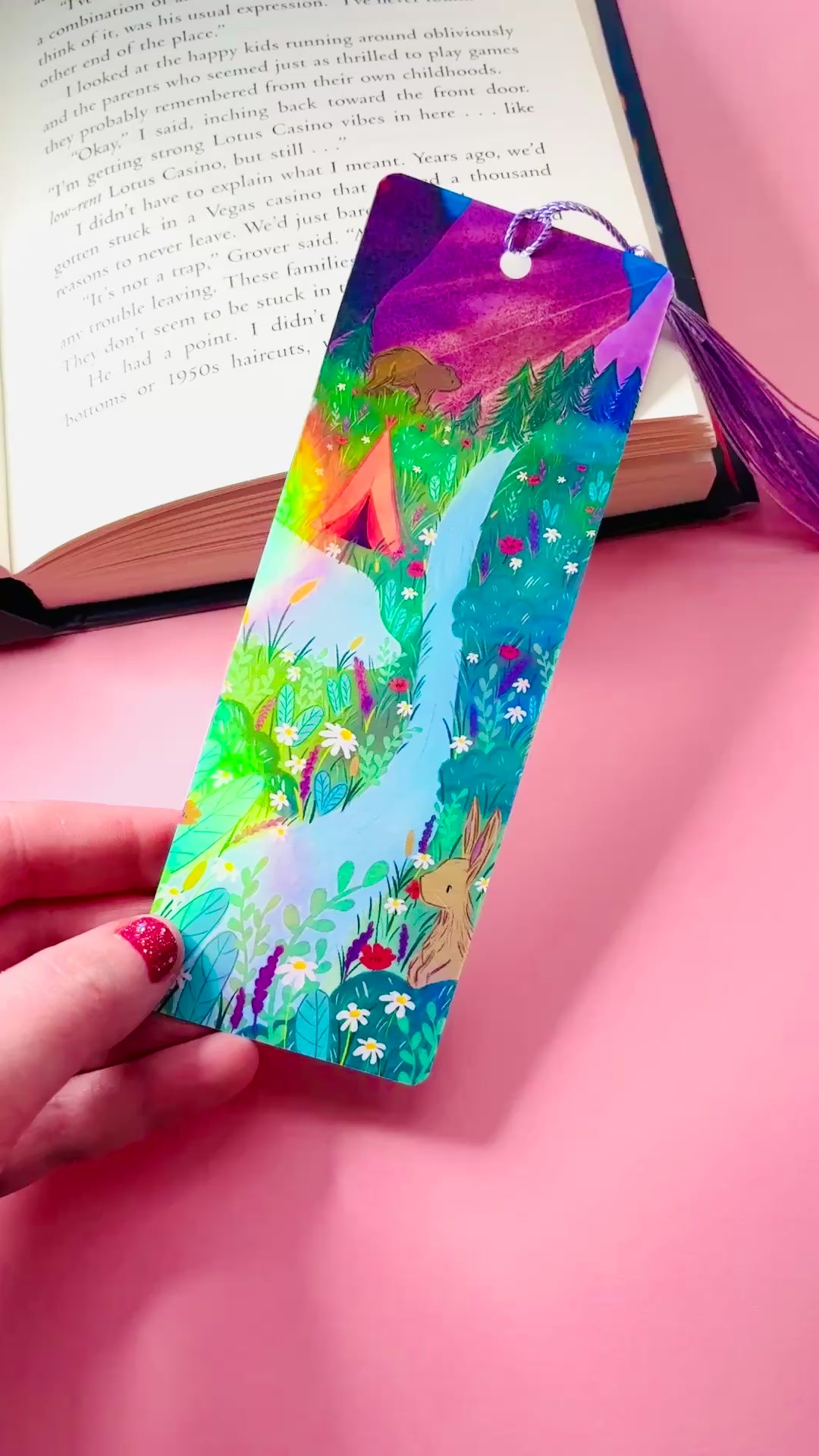 This bookmark features the original illustration of a cosy wild camp with colourful mountains, a trickling stream and a wildflower meadows.