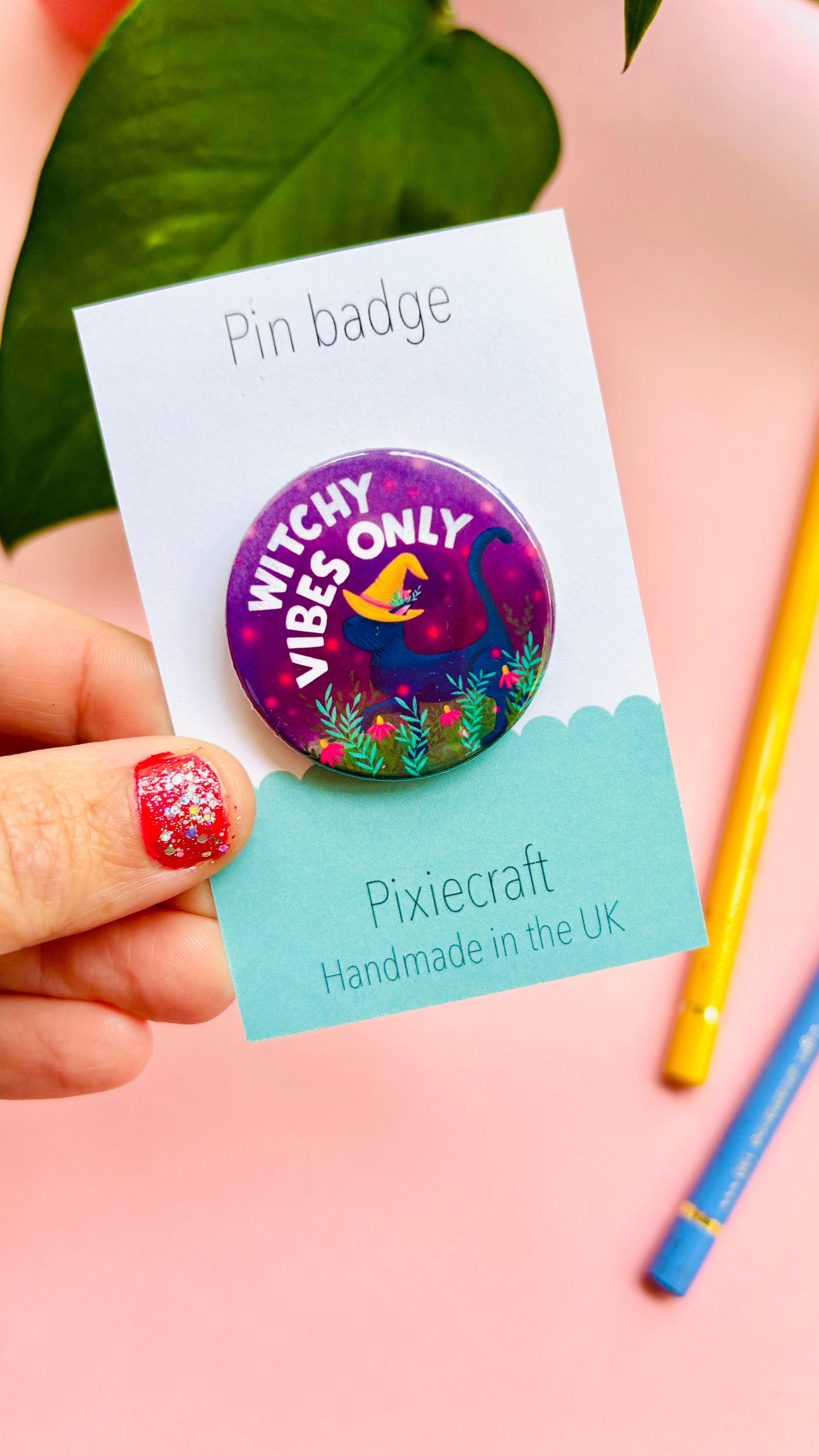 Add a little everyday magic to your outfit, backpack, or fridge with the Witchy Vibes Only badge or magnet. Featuring a charming black cat wearing a witch’s hat and surrounded by delicate wildflowers, this hand-illustrated design is the perfect mix of spooky and sweet. Whether you’re a cat lover, a witchy soul, or just obsessed with Halloween all year round, this cute accessory is a must-have.